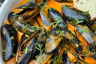 Mussels with a Spicy, Creamy Roasted Tomato Broth